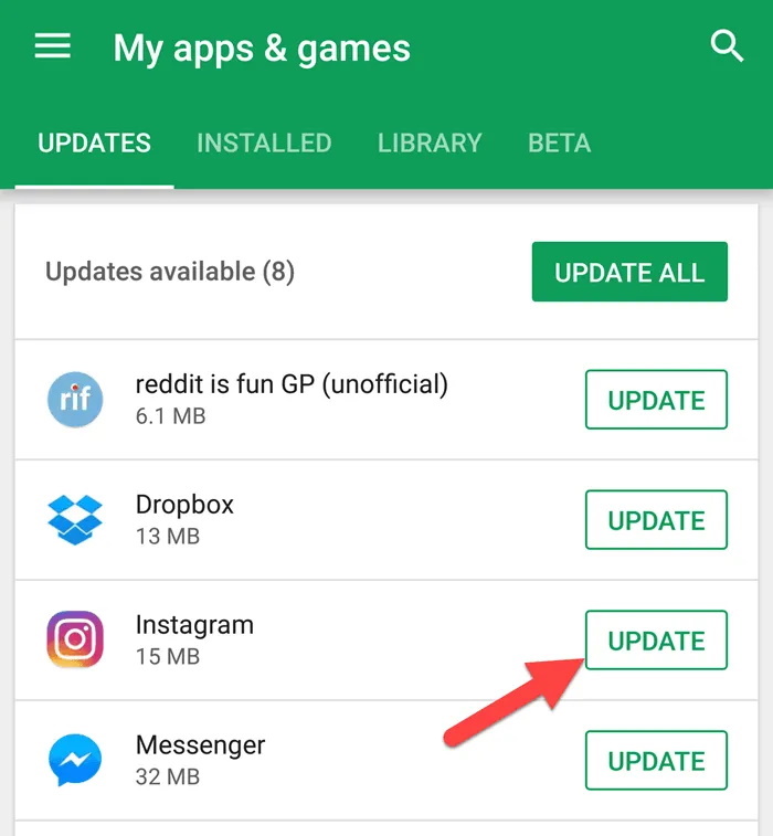 یکی دیگر از کارهایی که برای رفع اشکال اینستاگرام میتوانید انجام دهید، به روز رسانی اپلیکیشن نصب شده روی دستگاه است. اگر هیچکدام از روشهایی که در بالا گفته شد کار نکرد بهتر است اپلیکیشن اینستاگرام را به روز رسانی کنید. معمولاً در نسخههای جدید اپلیکیشن مشکلات اجرا نشدن و یا باگهای مربوط به آن برطرف شده است. از طرفی ممکن است قابلیتهای جدیدتری در این نسخه جدید اپلیکیشن در اختیار شما قرار خواهد گرفت.