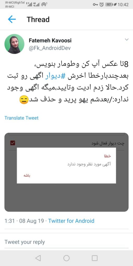 کاربری با نام فاطمه در این خصوص در توییتر نوشته است: «8 تا عکس آپ کن و طومار بنویس، بعد چند بار خطا، آخرش دیوار آگهی رو ثبت کرد. حالا زدم ادیت و تایید، میگه آگهی وجود نداره. بعدشم یهو پرید و حذف شد!»
