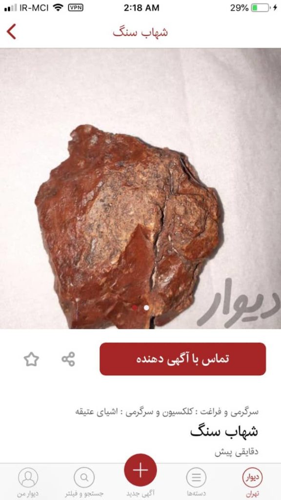 یکی از توییت هایی که به شدت جلب توجه می کند، آگهی فروش یک شهاب سنگ است. مسئولین دیوار قطعا در جریان هستند که چنین آگهی ای جز کلاه برداری نمی تواند معنی دیگری داشته باشد پس تایید چنین آگهی معنی خوبی برای کاربران این سایت ندارد.
