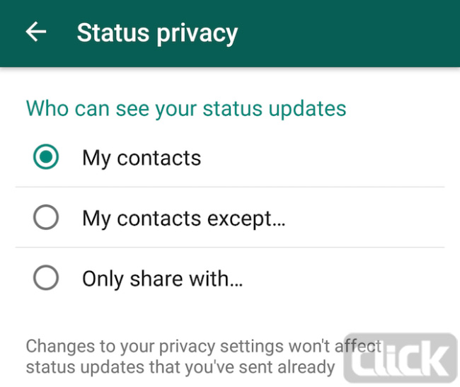 بر روی آیکون چرخ دنده کلیک کرده و سپس با استفاده از گزینه My Status (در سیستم عامل اندروید) و یا Privacy (در سیستم عامل iOS) میتوانید مشخص نمایید که کدامیک از مخاطبان قادر به تماشای استاتوس های شما باشند.