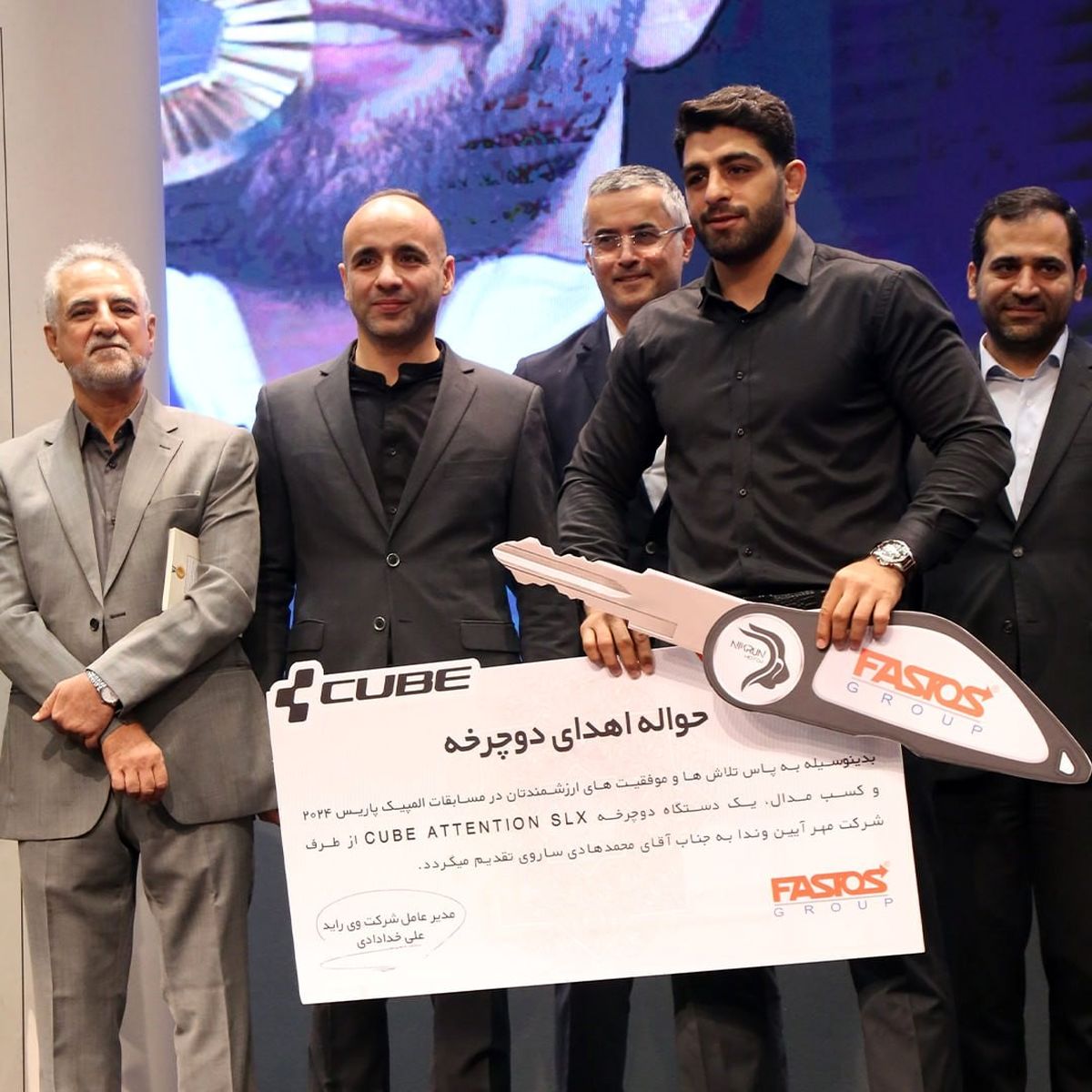 خدادادی ضمن بیان این که مجموعه وی راید با پایبندی به عهد دیرین خود، همواره، همراه تمام ورزشکاران و قهرمانانی است، افزود: «برای عزت و شکوه سرزمین ایران تلاش می‌کنند. به پاس قدردانی از تلاش‌های شما قهرمانان ملی، از طرف مجموعه وی راید، یک دستگاه دوچرخه کیوب آلمان (طبق وعده قبلی) به مدال‌آوران کشتی فرنگی و آزاد اهدا می‌شود. امیدواریم این هدیه کوچک، یادآور هدف مشترک وی راید و شما عزیزان برای رشد و شکوفایی کشورمان باشد.»