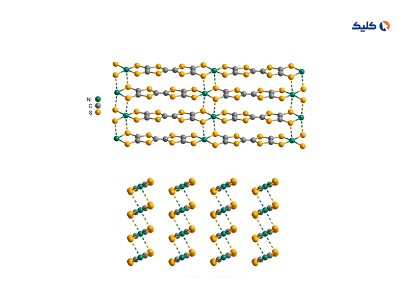 ساختار مولکولی یک ماده؛ اتمهای نیکل به رنگ سبز، اتمهای کربن به رنگ خاکستری و اتمهای گوگرد به رنگ زرد نشان داده شدهاند.